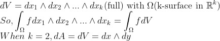여기서, dx^dy가 일종의 면적소 역할을 하고 있다. 이를 3차원으로 확장하면, 부피에 대해서도 똑같은 역할을 할 것이다.