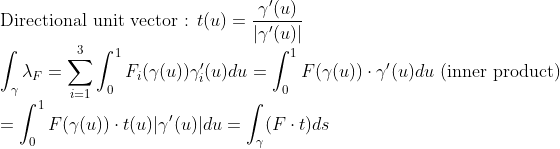 즉, 벡터장을 곡선의 방향성분과 수직 성분으로 나누면 수직 성분은 적분에 영향을 주지 못한다.