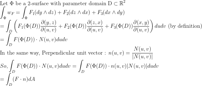 즉, 벡터장을 곡면에 수직한 성분과 아닌 성분(사실, 접평면에 평행한 성분)으로 나누면 접평면에 평행한 성분은 적분에 영향을 주지 못한다.