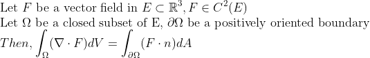 즉, boundary를 따라서 면적분한 결과는(boundary에 수직인 성분!!!) Omega 전체(3차원 set)에서의 Divergence(발산)과 동일하다!