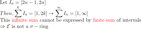 Ring의 정의만 가지고, 무한 합집합이 R에 포함되는 것은 모른다는 것이다! (해석학 앞쪽의 Set Theory 참고!)