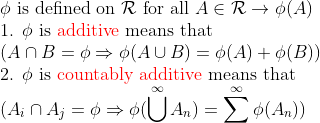 여기서 additive, countably additive는 set function이 가질 수 있는 성질이다.