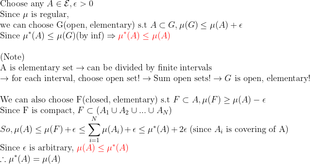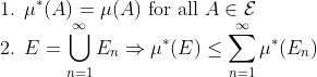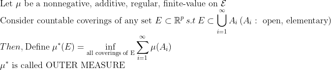 즉, 이 outer measure는 그냥 ring의 성질을 만족하는 곳에서는 우리가 아는 그 measure(mu)로서 작용하고, sigma-ring의 성질을 써야하는 무한합집합의 경우에는 부등식을 만족시키면서 measure의 역할을 해준다!