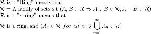 어차피 우리는 무한대의 구간의 길이가 필요한 게 아니라서 조금 더 좁혀서 sigma-ring에 대한 이야기를 하고 싶다...(예를 들어서 극한에 대한 이야기를 할 수도 있으니까!)