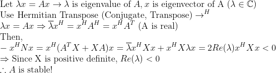 A가 Stable하면, eigenvalue가 모두 LHP에 있으므로, 서로 다른 eigenvalue를 더하면 항상 <0....