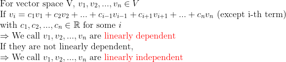 그리고, 선형독립이 아니면(즉, v를 만들 수 있으면) 선형종속(Linearly Dependent)이라고 한다.