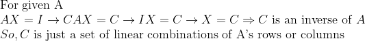 또한, 우리가 가우스-조던 소거법에서 Triangle matrix를 만들기 위해 했던 모든 연산들은 행렬곱이었기 때문에, 역행렬을 만드는 연산 결과도, 결국에는 원래의 행렬의 "선형결합" 벡터를 만드는 것과 동일하다.
