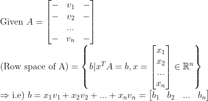 즉, Row Space는 A의 열벡터가 만드는 Linear Combination의 모음이라고 생각하면 된다. 또한, 다음과 같이 표현한다.