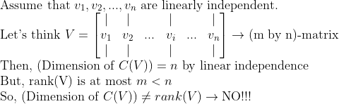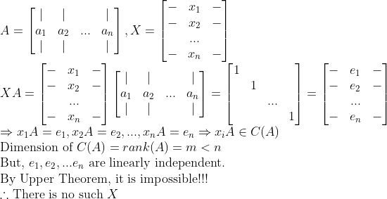 즉, 저 모든 n개의 standard vector들이 A의 Column space에 있어야 하는데, Column Space의 Dimension은 기껏해야 m이므로, 이 standard vector들은 linearly independent 할 수가 없다.