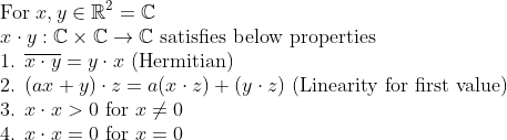 그러므로, 위의 연산은 (복소수벡터공간에서) "내적"이다!