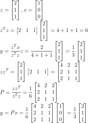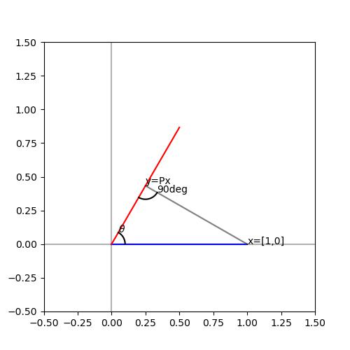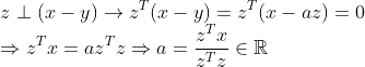 여기서 벡터 x는 파란선, z는 저 빨간 선이라고 하자. 그리고 우리의 사영된 벡터는 y가 될 것이다!