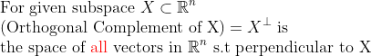 즉, X의 Orthogonal Complement는 X와 수직인 모든 벡터들을 모아놓은 Space라고 생각하면 된다.