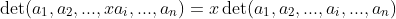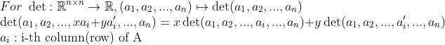 determination 정의를 생각해보면 permutation을 구해서 각 행렬 성분을 선택할 때, i번째 열을 선택할 때, 원래 값보다 x배한 값이 들어가는 것이므로 각 permutation(sigma)마다 x배한 값이 들어간다. 그러므로 상수배 조건을 만족한다.