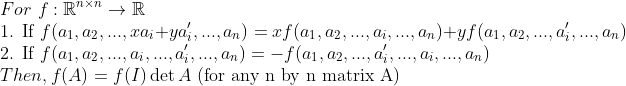 만일 어떤 함수가 (성질 1), (성질 2)를 만족한다면 이 함수는 determinant 함수이다.