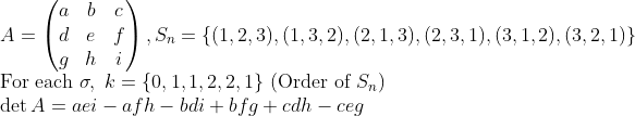 이렇게 해서 모든 permutation(sigma)에 대해 sgn과 각 row들의 permutation을 모두 곱한 것(위 식에서 큰 파이가 모두 곱한다는 뜻이다.)을 모두 더하면 우리가 원하는 det A가 된다. 아직도 이해가 안되면 아래의 3 by 3 matrix 예시를 보자.