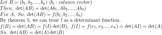 각 행렬 성분을 단위벡터로 다 쪼개서 정리하는 것으로 위 정리의 증명을 할 수 있다. 이 때, 전치행렬(Transpose)과 원래 행렬의 행렬식은 동일하다.(Permutation 잡아 성분 택할 때, 결국 같은 것을 택하게 된다.)