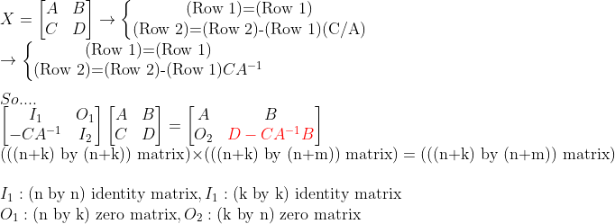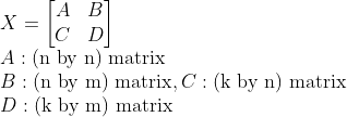 주어진 Block Matrix X가 다음과 같다고 생각하자. 이 때, A,B,C,D의 사이즈는 다음과 같다고 가정하자...(최대한 일반화하였음)