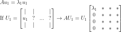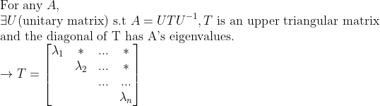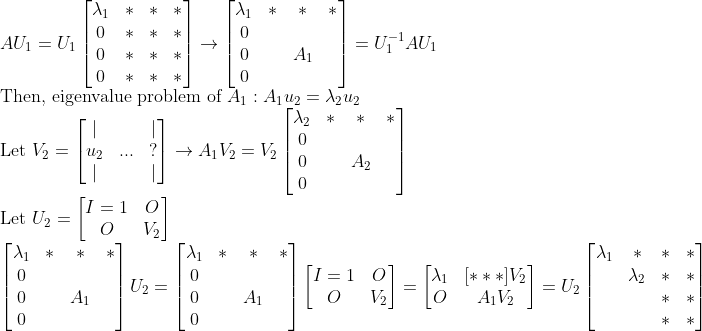 즉, 행과 열을 하나씩 줄여나가면서 Eigenvalue를 구해보면, 계속 Lower 줄을 하나씩 0으로 바꿔나갈 수 있으므로, 이를 반복하면 결국에는 Upper Triangular Matrix T가 나올 것이다.