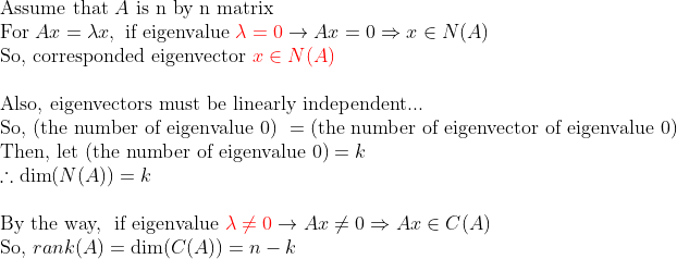 => 0인 Eigenvalue의 개수 = Dimension of N(A) =k