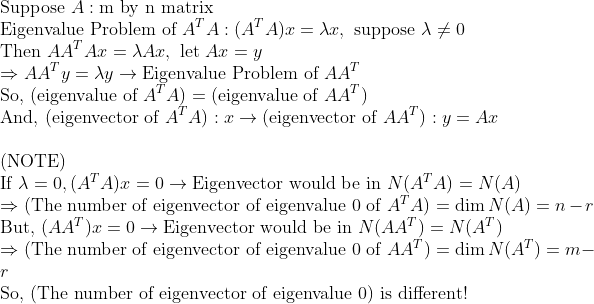 A^TA와 AA^T에서 0이 아닌 eigenvalue는 동일하다. 다른 건 오직 0인 eigenvalue의 개수이다.