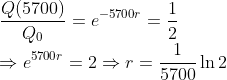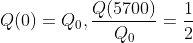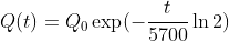원래 이 시료가 가지고 있던 탄소-14의 양을 Q_0라고 하고, t년이 지난 후의 탄소-14의 양을 Q(t)라고 하자.
