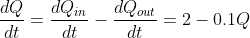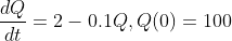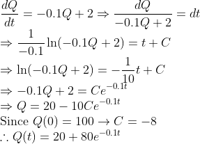 100리터의 물이 통에 담겨 있다. 이 통에 1초에 2리터씩 물이 들어오지만, 통에 구멍이 있어서 통에 있는 물의 양에 비례해서 물이 빠져나간다. 통에 들어있는 물의 양을 Q리터라고 할 때, 1초에 (0.1Q)리터씩 물이 나간다고 하면, 물의 양은 시간에 따라서 어떻게 변화할까???