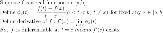 사실 저 위에 phi함수는 도함수(derivative)를 정의하는 것 때문에 사용한 것이고, 저 분수함수(평균변화량)가 x=c 근방에서 잘 정의된 것이 명확하다면 아래 정의를 써도 된다.
