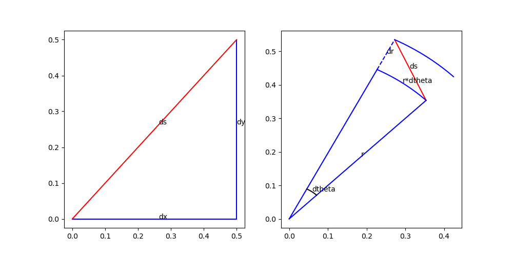 직교좌표계는 피타고라스 정리처럼 생각하면 될 것이고, 극좌표계의 경우에는, ds, dr, r*dtheta로 만들어진 삼각형에서 피타고라스정리처럼 생각하면 될 것이다.