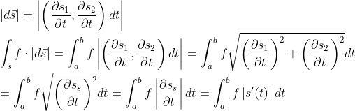 일변수함수 f를 곡선 s에서 적분하는 것으로, 곡선 위로의 좌표계 변환을 하고 있다. -> 적분결과는 실수(1차원)