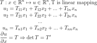 n차원 좌표계에서 x_1,...,x_n가 dx_1,.., dx_n만큼 변하면, T로 움직여진 좌표계(m차원)에서 u_1,...,u_m가 (Jacobian)* du_1,...,du_m만큼 변한다.