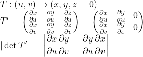 (u가 m차원에서 n차원으로 바뀌었다! -> 곡면에서의 예를 들면 n=2, m=3이었는데 사실 곡면의 z축이 항상 0이므로, m=2라고 생각할 수 있다... 또한, 곡면에서 |N|은 생각해보면 결국 곡면으로 변환하는 T(선형이라 T'와 동일)의 determinant와 동일하다.)