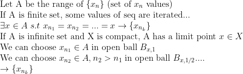 만약 {x_n}이 compact metric space X에서 정의되어 있다면, X의 point에 수렴하는 부분수열{x_nk}를 잡을 수 있다.
