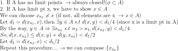 만일 x가 A의 limit point라면, x로 수렴하는 {x_n}을 A에서 잡을 수 있다.