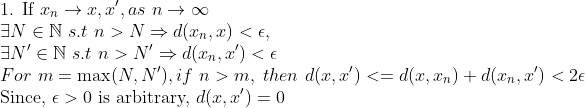 만일, 수열 {x_n}이 x와 x'로 수렴한다면, x=x'이다.