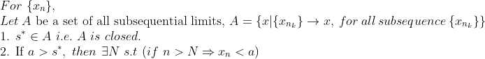 upper limit의 경우, x_n의 모든 subsequence의 수렴값들 중 sup(최댓값)을 뽑았다고 생각하면 된다.