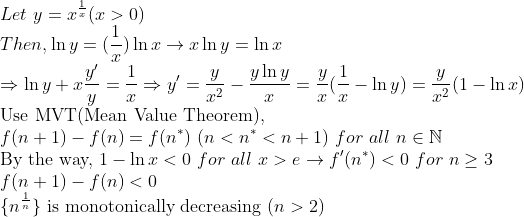 그러므로 일반항이 단조감소수열이다. (n>2인 경우...) 사실, finite개수의 항은 수렴성을 따질 때 무시할 수 있을 것이다.(어차피 수렴성에 영향 안 준다.) 그러므로, 그냥 똑같이 생각할 수 있다!