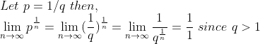 -> 일반항이 단조감소수열이고, 항상 1보다 크거나 같으므로 bounded -> 수렴한다.