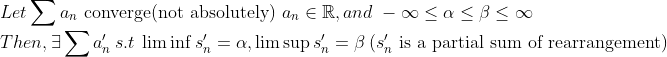 a_n이 실수이고, 절대수렴을 안하는 경우에 -> 재배열의 수렴값의 최대/최소(limsup,liminf)를 어떤 식으로든 bound 시킬수 있다는 말이다!