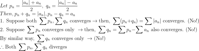 절대수렴은 안하지만, 수렴한다는건 -> 절댓값 다 더한 것이 무한대로 발산한다는 말!