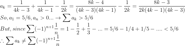 자연수집합이 무한집합이므로, 위의 두 급수의 부분합이 같지 않을 수도 있고 또한 수렴값이 같을 이유도 딱히 없다...