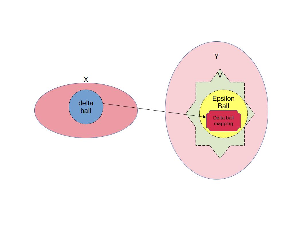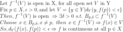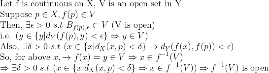 즉, V가 open 이니, V 안에 들어가는 open ball을 잡을 수 있다. 그런데 연속성에 의해 이 open ball 안으로 들어가는 X에서의 delta ball을 잡을 수 있다. 즉, delta ball이 V 안으로 들어가므로, V의 역상(preimage)에는 delta ball(open ball)이 포함되므로 V의 역상이 open set이다.