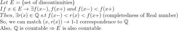 각 불연속점은 유리수집합과 대응될 수 있으므로 Countable set이다!