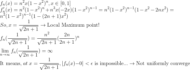 2. Uniformly Convergence 확인 -> n이 커질수록 Maximum 값이 튀므로, x=0 근처에서는 epsilon 아래로 못 내린다!