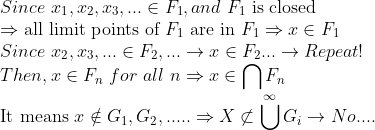 근데, 이 극점은 F1에도 포함되고, F2에도 포함되고,...... -> 모든 F_i에 대해서 다 포함되므로, F_i의 (infinitely) 교집합은 empty가 아니다. 그런데, 이 말은 G_i의 (infinitely) 합집합으로 X를 못 덮는단 말이므로, 모순이다!