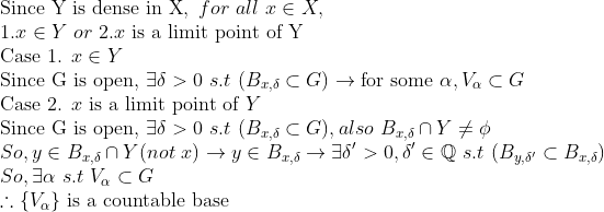 G가 open set이므로, x를 중심으로한 어떤 open ball(B_{x,delta})이 G에 포함될 것이다. 그런데 x가 Y의 limit point라서, 이 open ball에는 Y의 원소 y가 포함된다. (B_{x,delta}) 또한 open set이라서, y에 대해서도, (B_{y,delta'})가 (B_{x,delta})에
