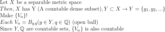 모든 Separable metric space는 Countable인 Base를 가지고 있다.