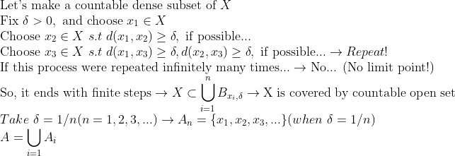 X가 Separable이라는 것을 이용하면, Countable base를 가지기 때문에, 결국 Countable subcover를 가진다고 할 수 있다.