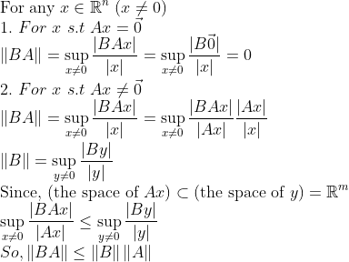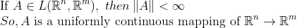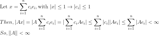 x를 각 성분별로 나눈 후에 Ax를 구해보면, 저 e_i들이 standard basis이므로, Ae_i들 각각은 분명히 R^m에 존재하고, 벡터의 norm이 infinite가 아니니, Ae_i들의 norm의 유한합은 당연히 infinite가 아니다!