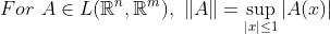 3. 만일, 벡터공간 X,Y가 "유한차원" 유클리드 공간이라면, (Space of linear transformation)의 각 원소마다 Norm을 설정해줄 수 있다. 즉, (Linear Transformation)의 Norm을 다음과 같이 정의한다.
