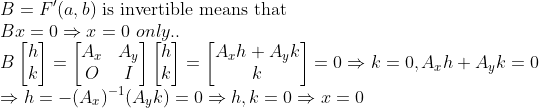 F'(a,b)가 invertible인 것은 determinant 말고도 다음과 같이 보일 수도 있다.